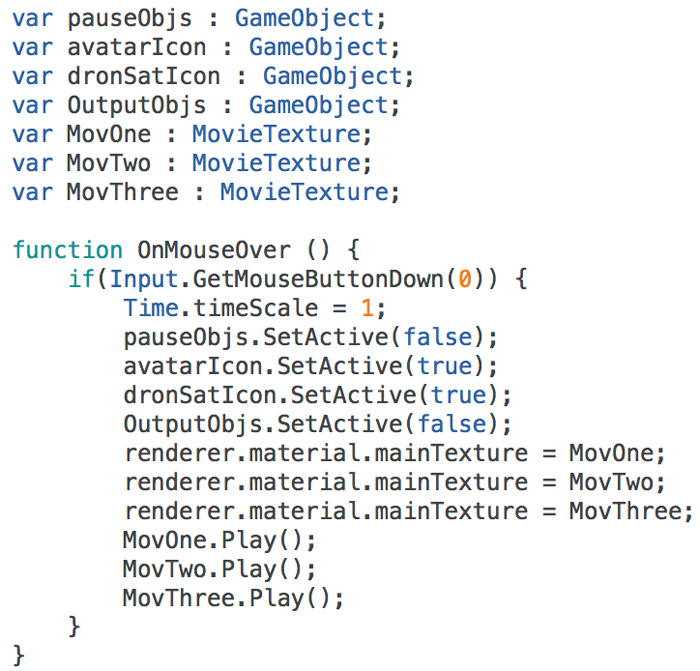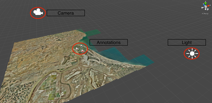 In the satellite view the client needed to have a top 2D satellite view and then when you look down you will see some annotations on the map so you get more info and watch a video. This was very simple as I just added texture (satellite images) to the scene and added a camera on the top. When you click on the annotations a video will play.