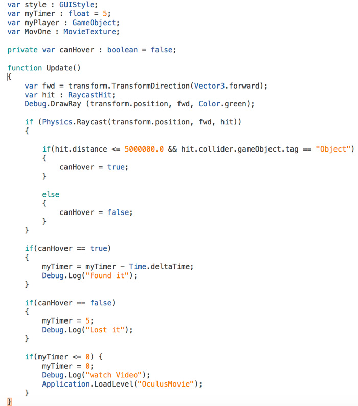 In the VR version it is very similar to the 3rd person view except the user will no longer will need to click on the 3D object to view the image. If the user just looks at the object for 5 second then the video will be played automatically. This is done though raycasting, a Unity feature.