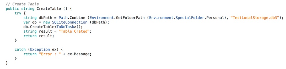 "TestLocalStorage.db". Second was a function to create a record within that table. [Refer to Image 8 & 9]