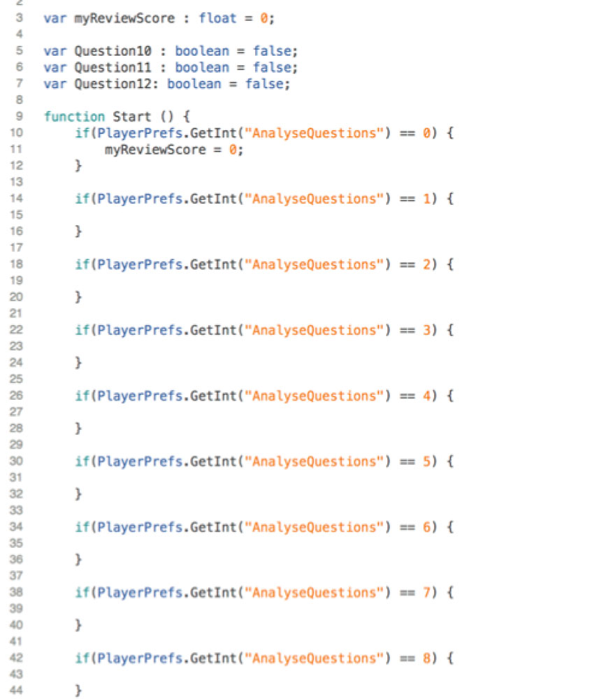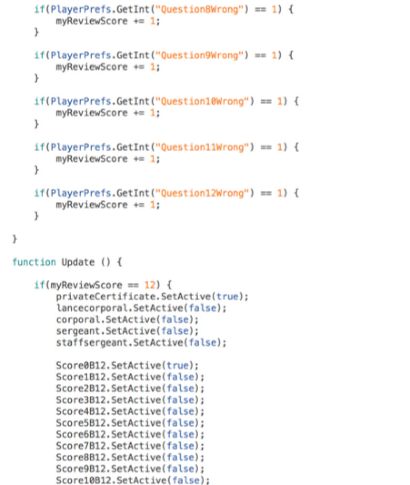 With review you had 12 questions and 5 certificates. The way this works is that if you achieve 2-4 questions correct you get x certificate and if you achieve 5-7 questions correct then you get y certificate. So in the code I had to write an if statement for all 12 Player Prefs integers one by one as I had to display how many questions the user got right.