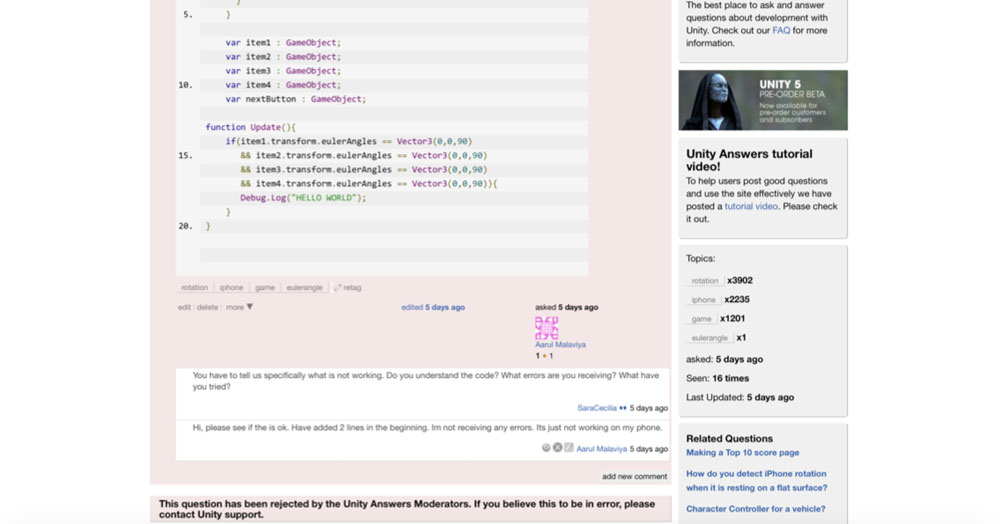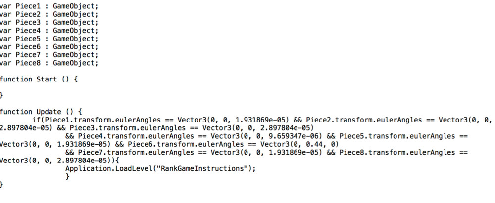 For the actual detection of the object it uses the "Update" function and checks if the stated mentioned is true. In this case 8 variables have been determined that are the 8 puzzle pieces and if all 8 pieces have been turned to a specific Vector 3 rotation then change the scene as in go to next question. It uses a method eulerAngles to determine the rotation.