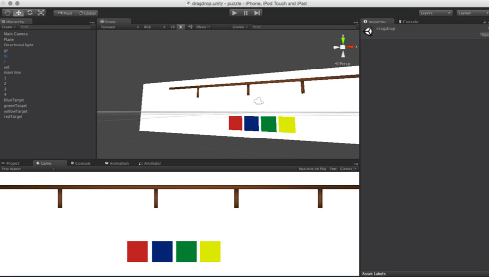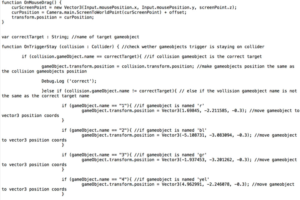 For the drag and drop game I practiced by dragging 4 cubes into correct place. Firstly it uses functions "On Mouse Down" and "On Mouse Drag" so that the object can be dragged with your finger. I had added a variable that defines the correct target of the correct position of the item being dragged and where it needs to be placed. It uses the function "On Trigger Stay" to know if you drag the object to the correct place it snaps to new position displaying that you found the correct target else the object is placed back where it originally was. It uses the collision method to recognize that if the object collides or hits the correct target then snap on to its position else place it back to its original position.
