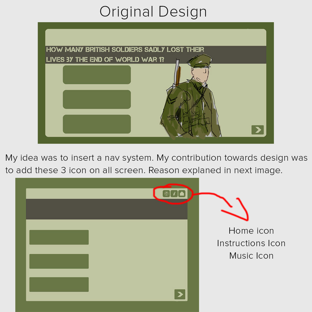 The original design that we took over from the previous group was that you only had 1 way to go which was forward. If the user wishes to leave the game or wanted to look at the instruction, he couldn't because the app doesn't allow you to. That's why I thought of adding a home icon and an instructions icon on every page so that the user knows what he/she is doing and always has the option to leave and try something else in the app and not wait for the specific game to finish. I also thought about adding audio to the app but then it occurred to me that it's a museum and you're suppose to be quite or speak softly. Hence we dropped the idea but in our original plan there was audio.