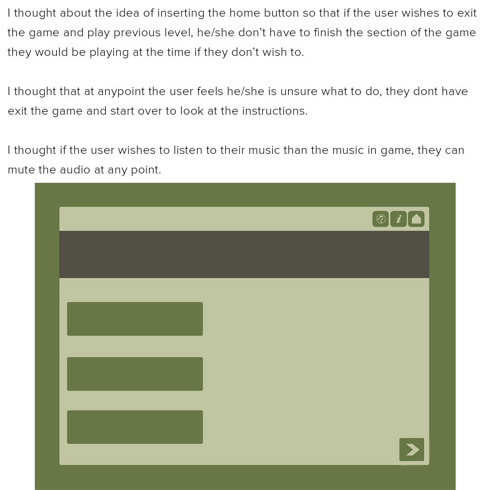 I would have also added a new section on the home page called level select which means that if the user just wanted to play the multiple choice questions or he just wanted to play the drag and drop game or any of the puzzles he could straight away play it and not have to play all the game to play just one single game. And by the way the user will have to play the full game at least once to unlock and play specific games in the level select page.